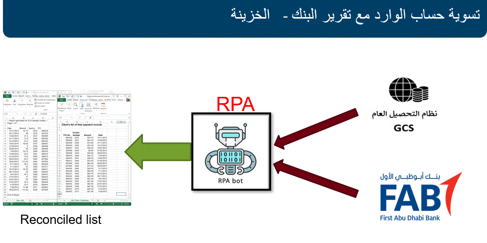 جاري العمل على استخدام تقنية الروبوت للقيام بعملية تسوية نظام التحصيل العام بكشف الحساب البنكي وكذلك تسوية تقرير الكاش مع كشف الحساب البنكي مما يزيد من القة وسرعة الانجاز وتوفير الوقت و الجهد